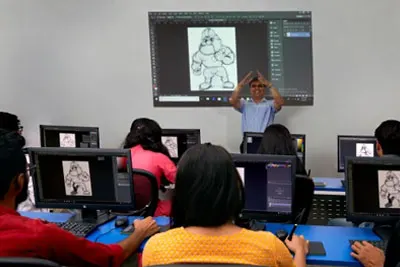Our animation school boasts world-class infrastructure, surpassing international standards. Our VFX and animation classes are held in fully air-conditioned classrooms, complete with LCD projectors. We also have a state-of-the-art Chroma Studio, Sketching Lab, Animation Labs with top-of-the-line workstations, Video Editing Lab with I-Mac, Game Design Lab, and Game Play Studio. Our facilities provide students with immersive, hands-on experience to nurture their skills and unleash their creativity.